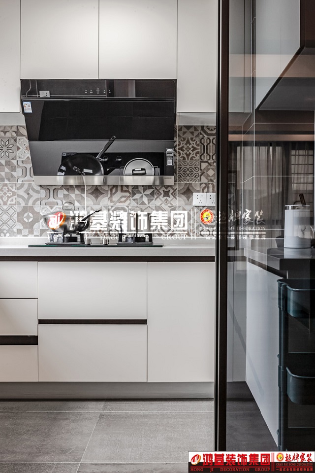 圖8.亮點(diǎn):廚房采用當(dāng)下流行的極窄推拉門透明玻璃的設(shè)計(jì),墻面采用花磚設(shè)計(jì),拒絕平庸,使整個空間充滿時尚感。